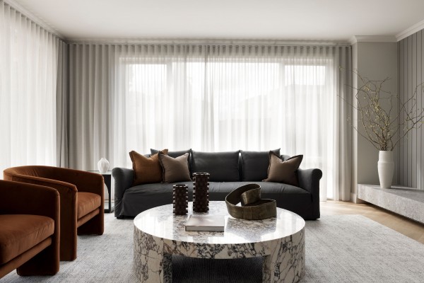 For the Architects that Lovelight has the pleasure of working with the curated Antipodes palette offers perfect neutrals; it has a natural linen fleck allowing Antipodes to sit seamlessly within either cool or warm colour schemes. The Barwon Heads House (above) and Walnut House (below) by Adam Kane are prime examples of where this fabric has been used to compliment the clean lines and vaulted ceilings. As Annie describes, “I love the clever use of natural light and open spaces where boundaries blur between indoors and out. I’m a huge fan of interior spaces that focus on texture – in these homes I really appreciate the juxtaposition of raw hard surfaces; where concrete, timber and stone combine with layers of tactile soft furnishings in their choice of upholstery, area rugs and, of course, softly draped James Dunlop sheers which allow dappled light to enter the spaces.”